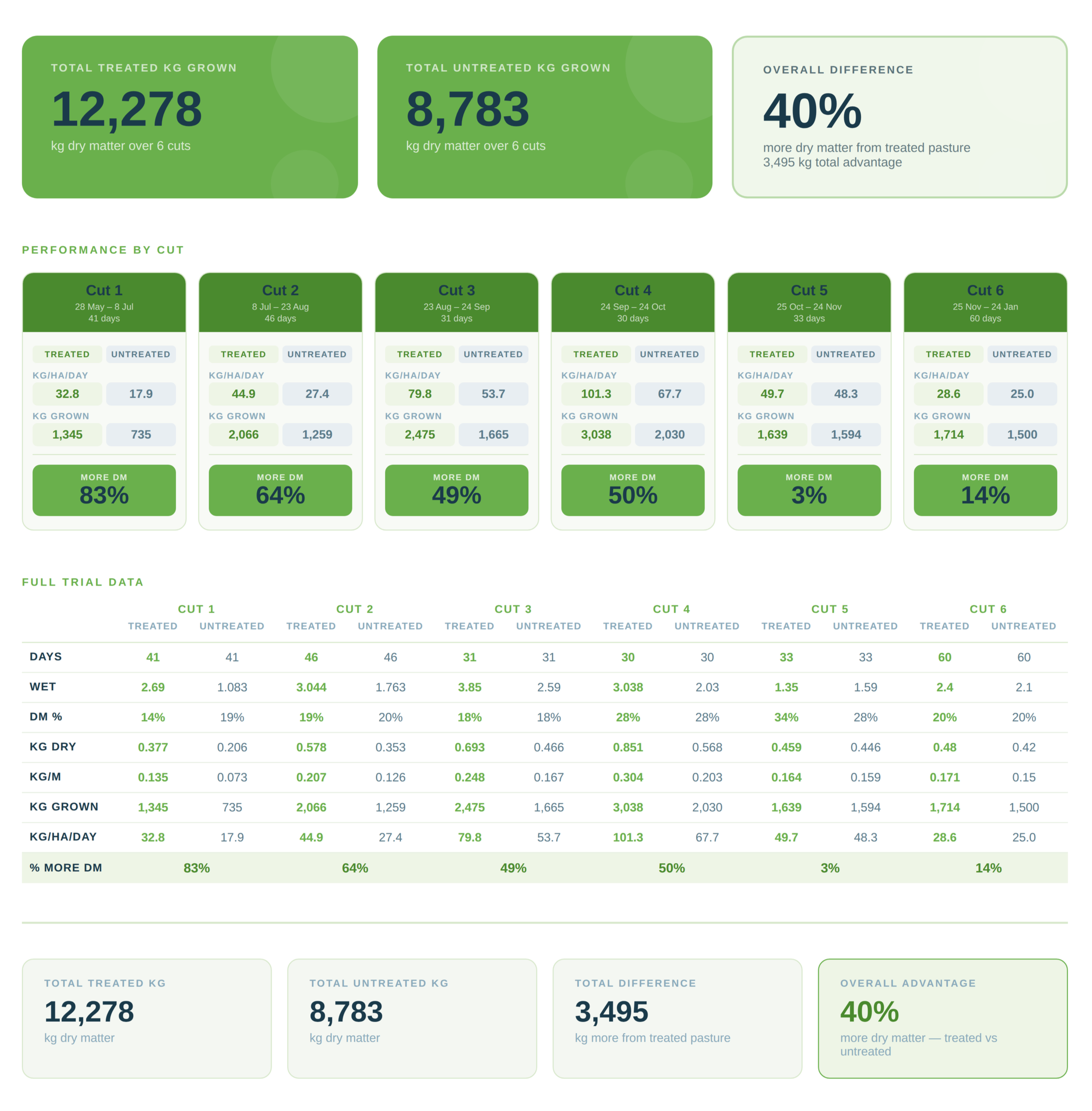 By Cut 1, treated pasture was producing 83% more dry matter per hectare per day than untreated. By Cut 4, the gap was still sitting at 50%. Even in the tougher late-season cuts, treated pasture kept its lead.